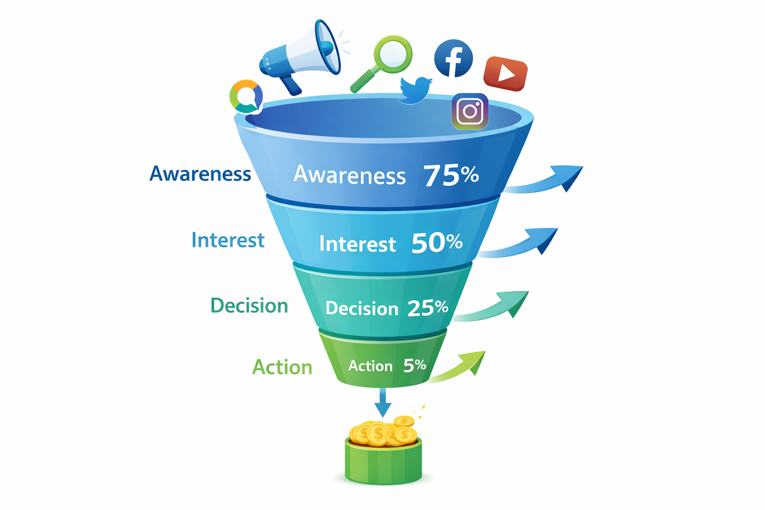 Your digital presence is a funnel. Traffic enters the top, buyers emerge from the bottom. Optimizing each stage increases what comes out the end.